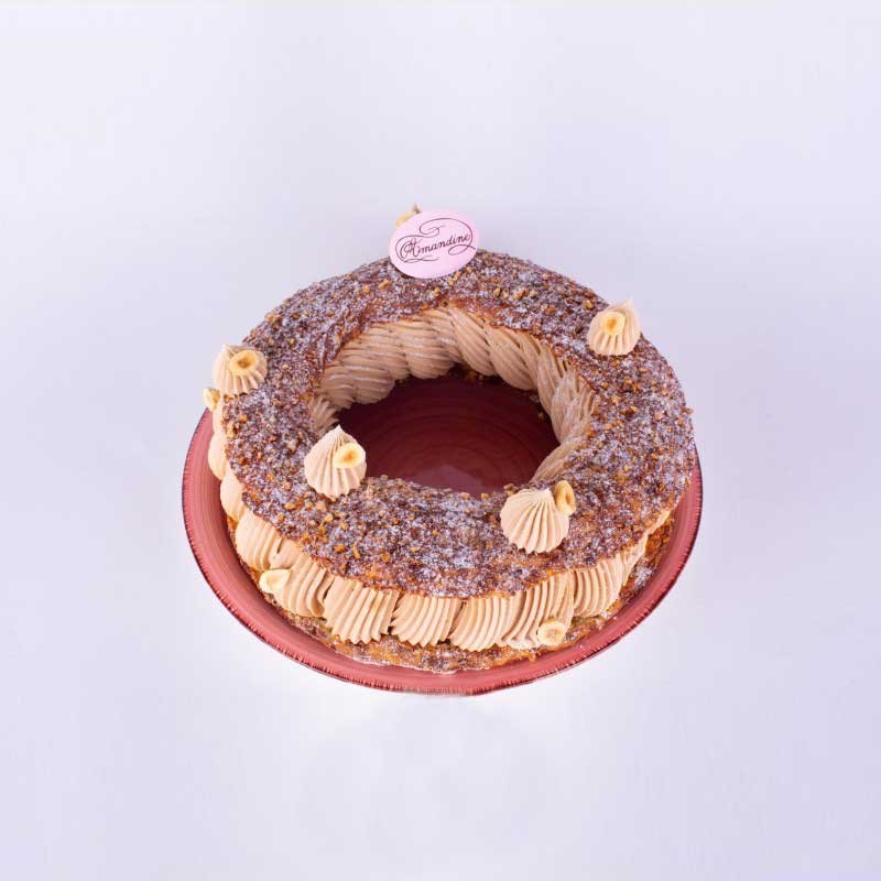 Pâte à Choux Vanille, Croustillant au Gianduja, Crème Montée au Praliné, Pâte de Noisettes et Noisettes Caramélisées.
