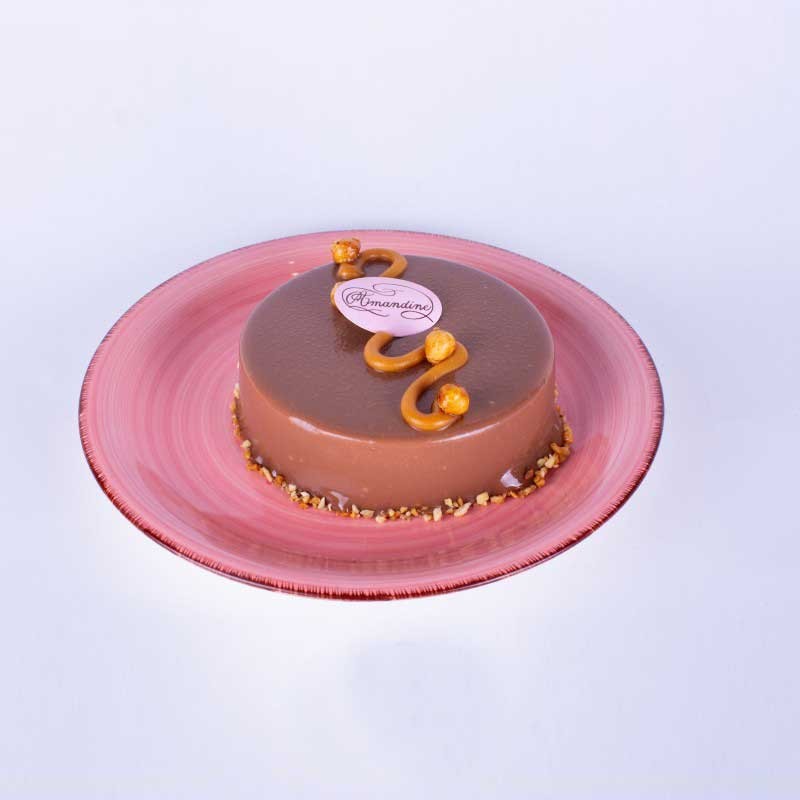 Dacquoise Noisettes, croustillant au Gianduja Noisette, caramel Tendre à la Fleur de Sel, noisettes Caramélisées, mousse Chocolat au Lait Noisette.