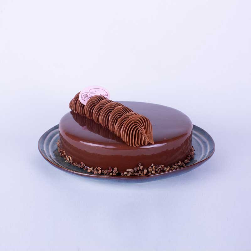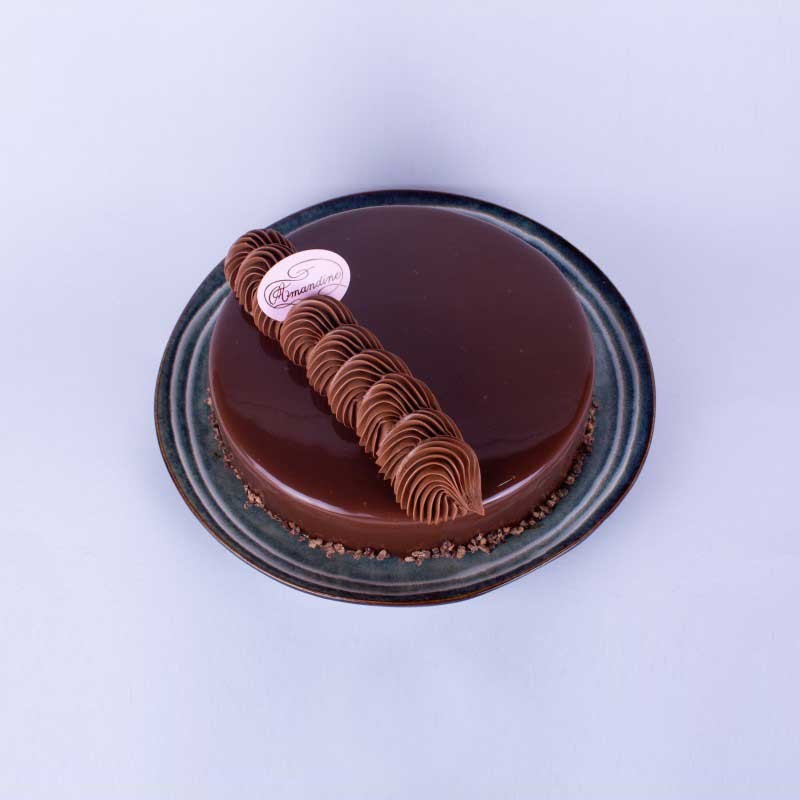 Dacquoise Noisettes, Croustillant au Chocolat au Lait, Crémeux Chocolat Caraïbes 66%, Mousse au Chocolat Noir Guanaja 70%.