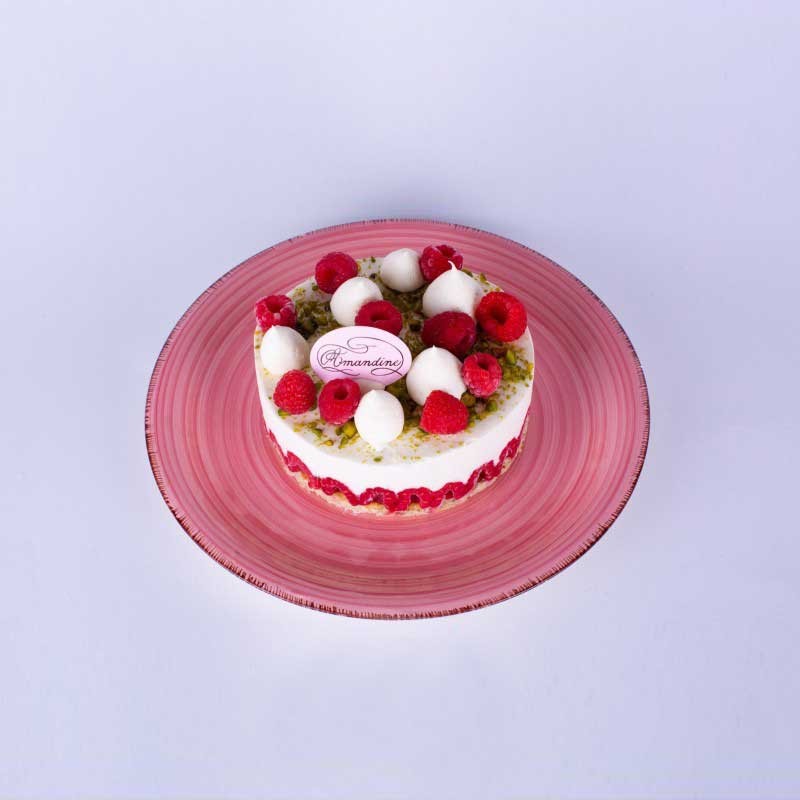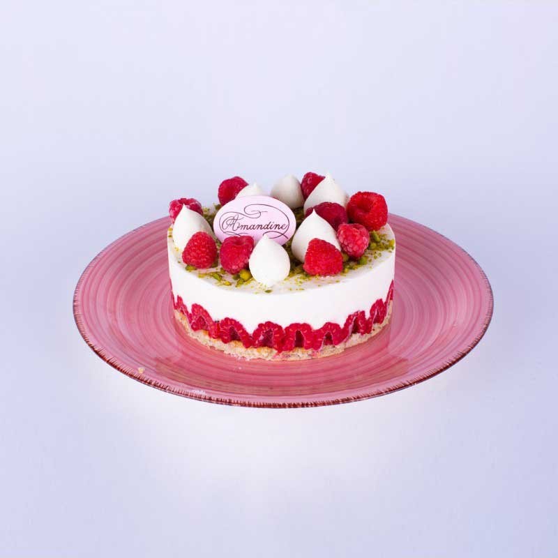 Biscuit à la Pistache, Compotée de Framboises, Ganache Montée Vanille, Framboises Fraîches, Morceaux de Pistaches Torréfiés.