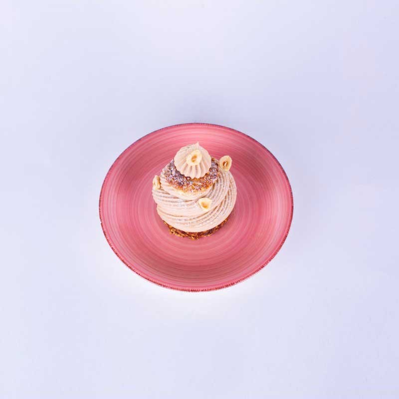 Dacquoise Noisettes, croustillant au Gianduja Noisette, caramel Tendre à la Fleur de Sel, noisettes Caramélisées, mousse Chocolat au Lait Noisette.