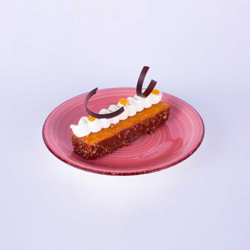 Dacquoise Noisettes, croustillant au Gianduja Noisette, caramel Tendre à la Fleur de Sel, noisettes Caramélisées, mousse Chocolat au Lait Noisette.